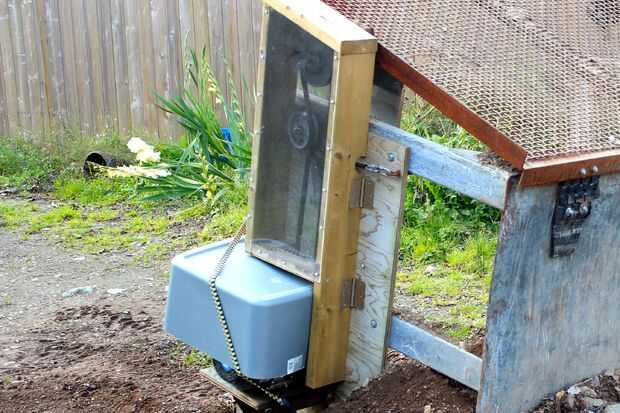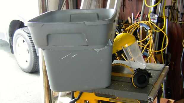 Corte un recipiente grande de plástico para la protección de la lluvia de motor. Una cuerda del amortiguador auxiliar mantiene la tapa en su lugar.
