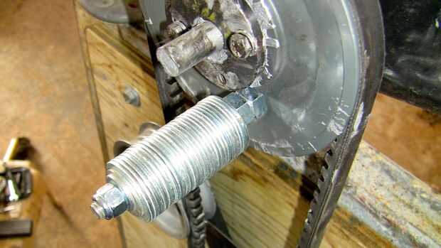 Hice algunos experimentando con varios pesos para conseguir lo que terminé aquí. Una imagen en este paso muestra el cinturón lanzado apagado la polea debido a demasiado peso y demasiada vibración. Pero otros factores influyen en que la acción de agitación deseada y para mantener la correa en las poleas. Por ejemplo el resorte rueda loco puede no tener suficiente tensión, las poleas pueden no estar en alineación correcta o no se puede apretar el tensor lo suficiente.