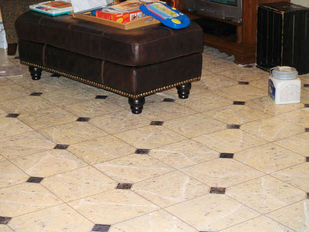 Pintado sobre azulejo de 12 x 12 de 30 años, aplicado con adhesivo, sobre concreto. Cualquier técnica de marmoleo que he encontrado es difícil. Hacer un piso grande sería demasiado difícil de abordar con mi artritis y fibromialgia. Me tomó 10 años para entender este método de marmoleo. Es fácil y rápido. Mucho trabajo, pero no es difícil. Los resultados son fenomenales y llevar muy bien. Desde que terminé este trabajo hace algún tiempo, les mostraré fotos de demostración en madera prensada.
