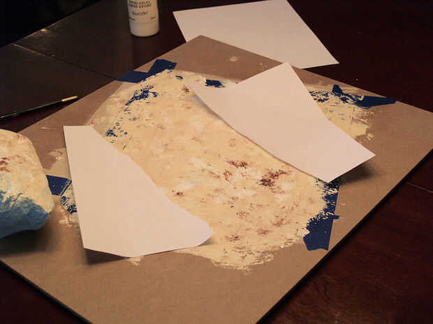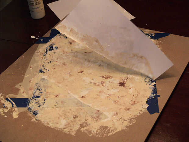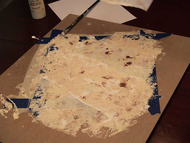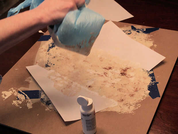4. ahora la magia, haciendo que las venas: rápidamente, tome un pedazo de papel rasgado y Coloque suavemente en el azulejo. Cada loseta debe tener su propio patrón de vetas.