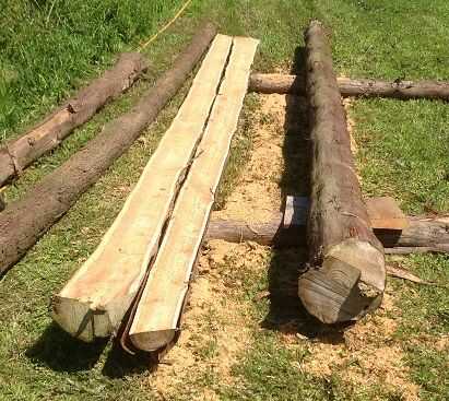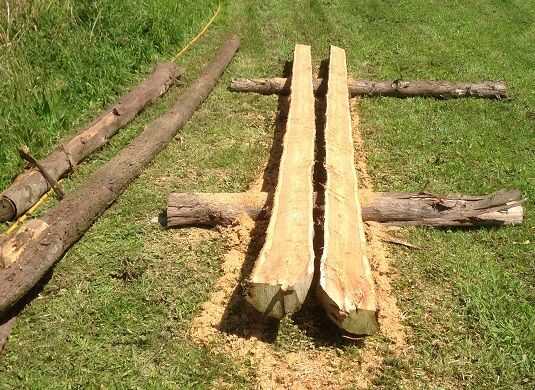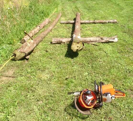 Ahora para los troncos de los árboles. Es muy difícil encontrar troncos absolutamente rectos y todas las que usé estaban ligeramente plátano en forma debido al viento reinante en el bosque donde crecían. Mis árboles son cedro rojo occidental es fácil de cortar y muy duradera en el exterior. Todo aquí está hecho de troncos de árboles largo de 4 m.