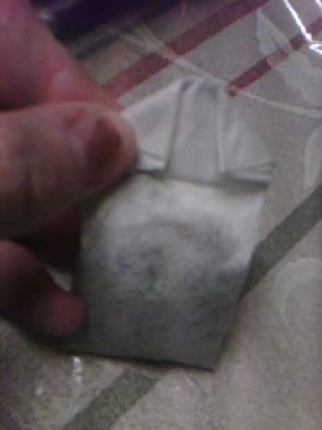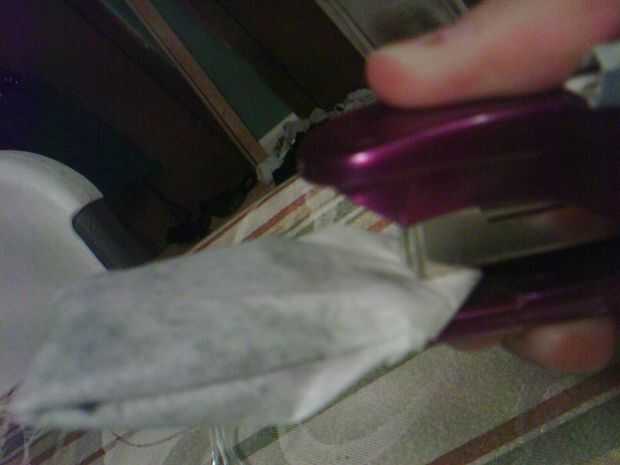 Si quieres, antes de grapa plegable puede Agregar una cadena al saquito. Si no tienes cuerda útil, sólo Coloque la bolsa de té en su taza de té y pescarlo con la cuchara cuando esté listo para sacarlo.