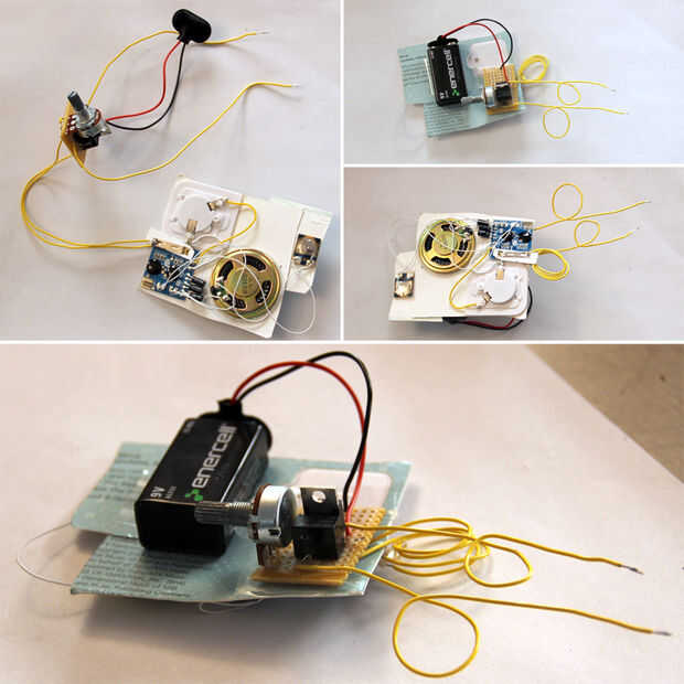 Después de conectar todos los componentes en una placa perforada, conductores fueron atados desde las terminales de la tarjeta de felicitación para el relé y el circuito de placa perforada fue unido a la parte posterior de la tarjeta de felicitación electrónica.