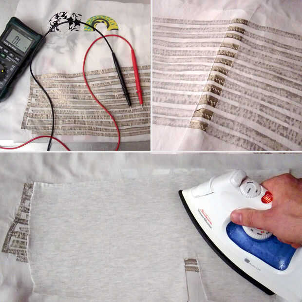 Tenga a mano su multímetro y prueba para la conductividad. No desea que los bordes deshilachados para completar el circuito sin humedad. Cuando tu matriz se cose en con éxito otra capa de fusible matriz de vinculación fue añadido en la parte superior para mantener a la malla en su lugar y evitar cualquier falsa conectividad una vez finalizado el cableado. Otro pedazo de tela de algodón era hierro en la matriz de vinculación fusible después. Se dejó un pequeño hueco para permitir que los cables del circuito ser conectado a la matriz de sensores de humedad. Lleva tela conductora se cubrieron en la tubería del encogimiento del calor y cosida a cada lado de la matriz. Estos cables se unirán con la humedad las puntas de prueba en el circuito de detección.