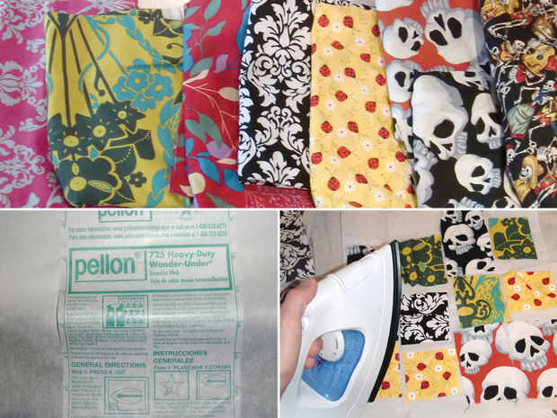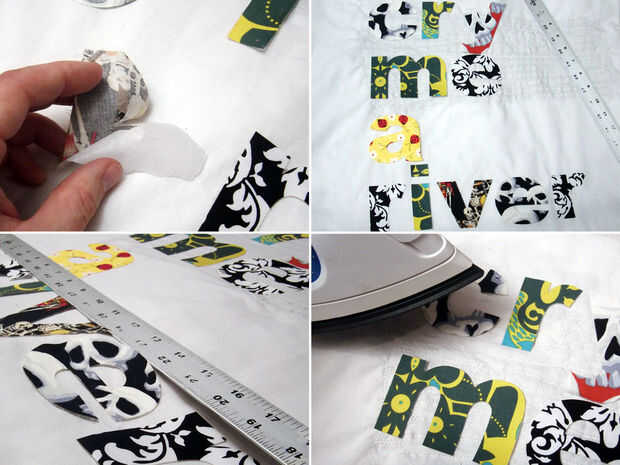 Restos fueron establecidos en la matriz de vinculación fusible y planchadas. A continuación los trozos fueron cortar las letras individuales y luego planchar por la cara externa de la almohada. Vuelva su almohada y el funda de la almohada, dejando una pequeña abertura a coser. para que pueda girar a la derecha de la almohadilla hacia fuera otra vez.