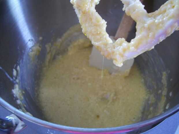 Paso 2: Batir huevos, extracto de vainilla y mantequilla saborizante a velocidad media-alta durante 2-3 minutos, parando para raspar hacia abajo los lados del recipiente como sea necesario hasta que la mezcla esté lisa y aparece mezclado. Debe ser color amarillo.