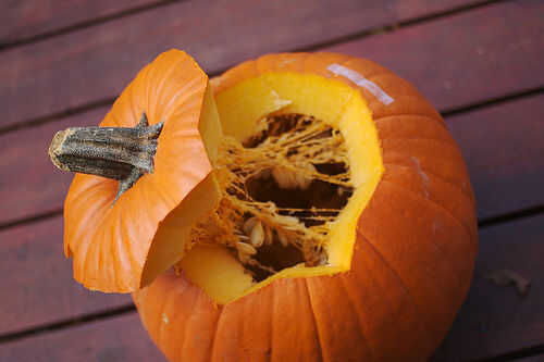 Averiguar donde en la calabaza será la parte superior de su patrón. Marcar con un trozo de cinta, para que no corte la tapa más allá de él. Cortar la tapa y saque los interiores de la calabaza. Yum!