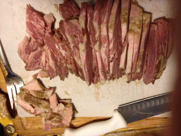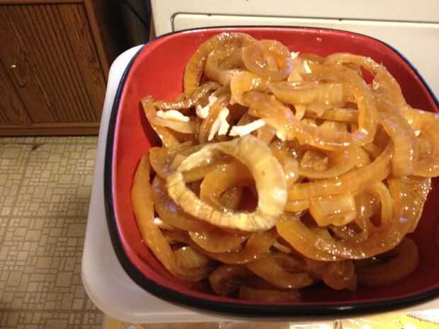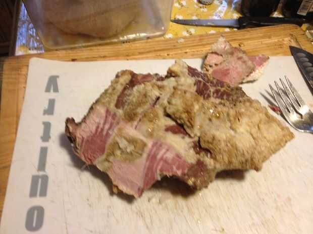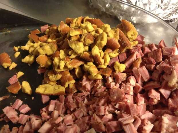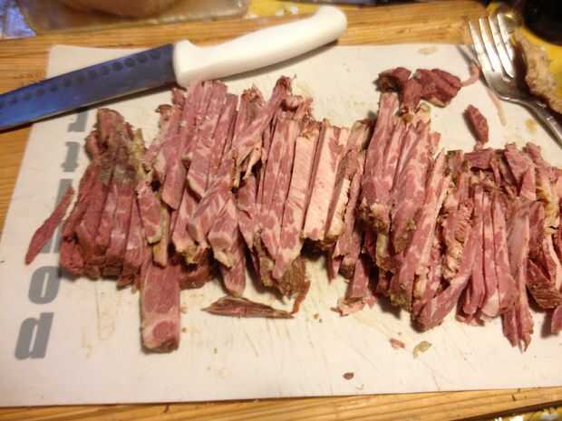 Cortan la carne o el freno con dos tenedores (Cociné la carne la noche antes por eso parece fría en la nevera) pequeños trozos pequeños.