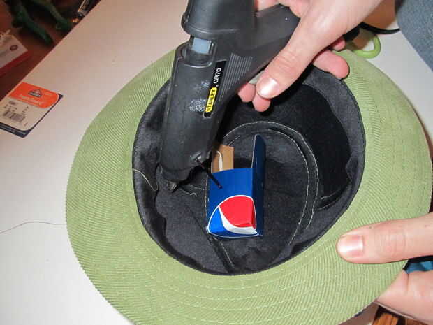 Ahora poner pegamento en la cartulina y coloque el compartimiento en la superficie más plana en el interior del sombrero.