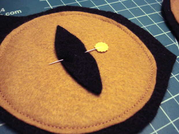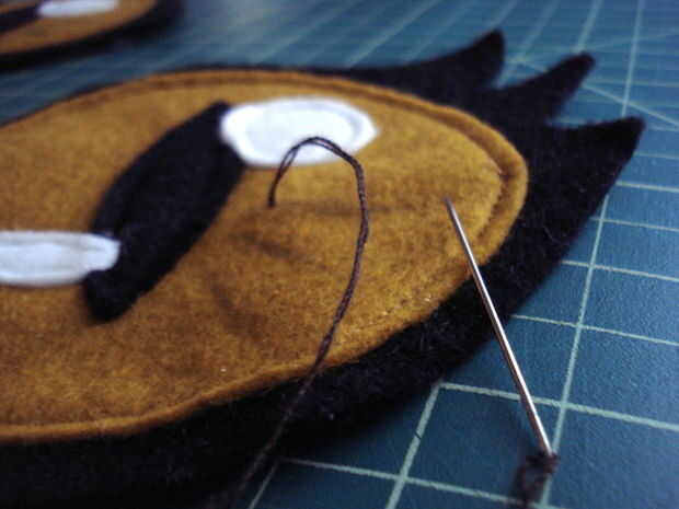 Después de los globos oculares están montados, tomar un hilo y aguja y coser 3 líneas en cada ojo para darles ese brillo.