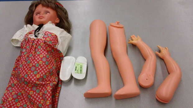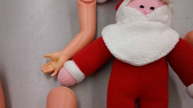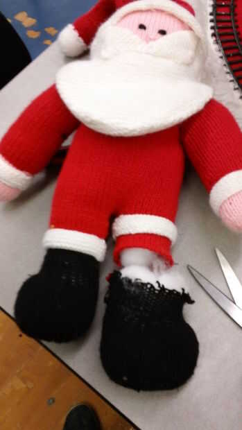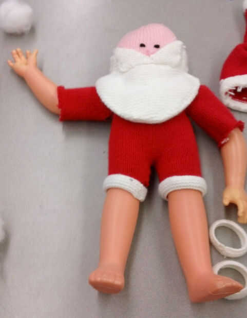 - Para construir la Santa que es superior el árbol, hice una especie de FrankenSanta. Tomó los brazos y las piernas de la muñeca espeluznante y fijarse quirúrgicamente a los desmembrada punto Santa. La cabeza de este nuevo espíritu de la Navidad sin duda sería mi propia.