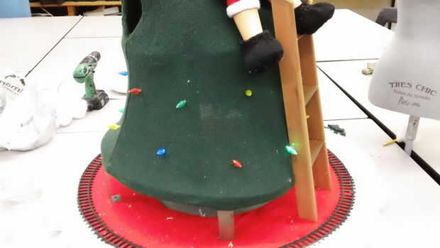 - He añadido algunas decoraciones alrededor de la base del árbol para ayudar a esconder mis piernas y las abrazaderas que sujetan la base de madera contrachapada para el anillo inferior del árbol.