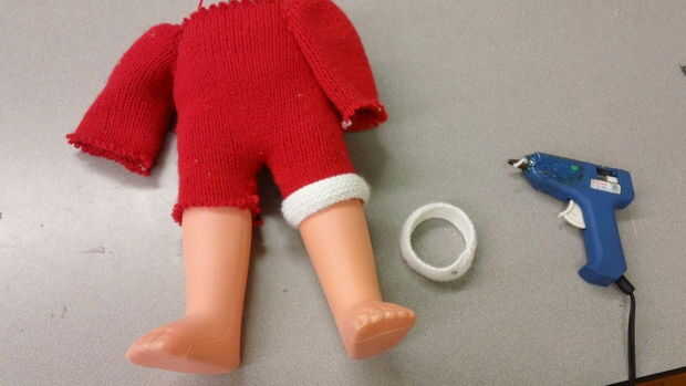- Utilicé el blanco esponjoso de dólar dos tienda sombreros de la Navidad para reparar las heridas que pelan los brazos de la chompa.
