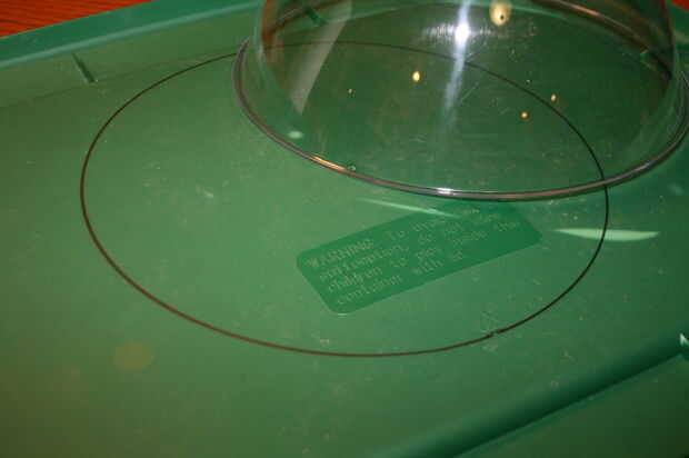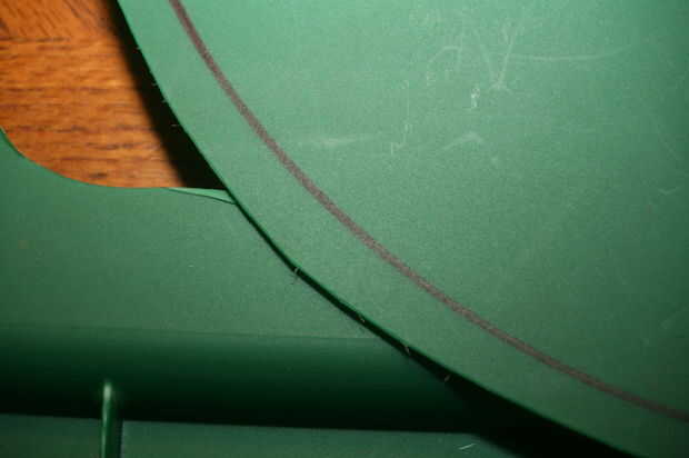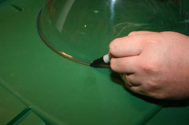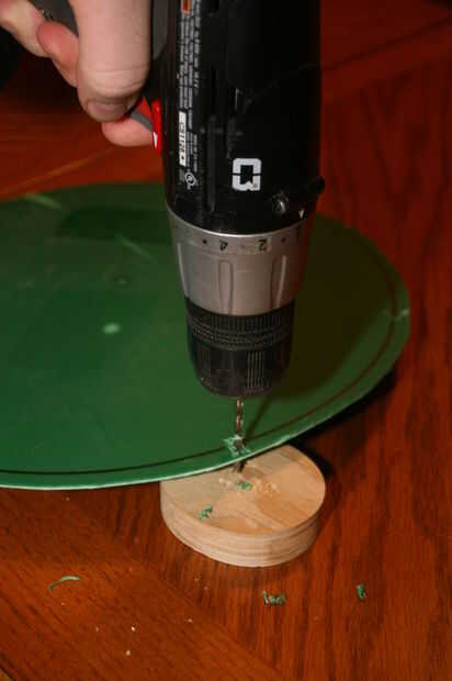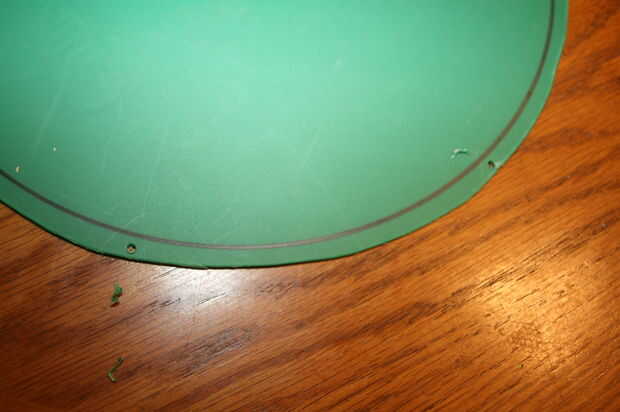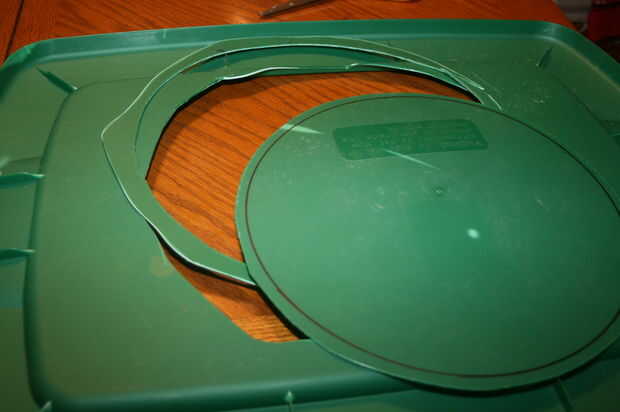 Empezar haciendo la espalda trazando el borde del tazón de fuente plástico transparente en la tapa de la bolsa de plástico y utilizar tus tijeras de trabajo pesado o cuchillo para cortar alrededor de su línea de traza añadir un extra 1/4" todo el camino alrededor de la línea de rastreo (el 1/4 extra" se utilizará para conectar el mundo a la chompa.) A continuación perforar una serie de agujeros alrededor del perímetro del círculo que sólo se cortan de la tapa de la bolsa, estos agujeros se utilizará para conectar el mundo al suéter después, perforé 8 agujeros equidistantes para el accesorio.
