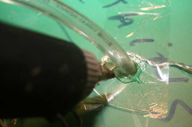 Inserte el tubo y caliente pegamento alrededor del tubo para sellar y mantener en su lugar.