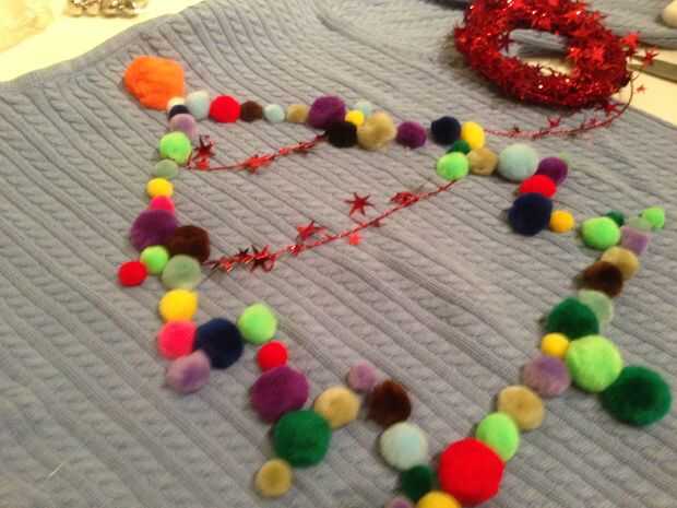 Materiales:Suéter deClaro plástico regalo papel de regaloPapel de embalaje de regalo de NavidadPeluche NavidadNavidad guirnalda oropelNieve falsaLos copos de nieve de fieltroArcos y cajas de regalo miniLuces de Navidad con pilasLetras de la etiqueta