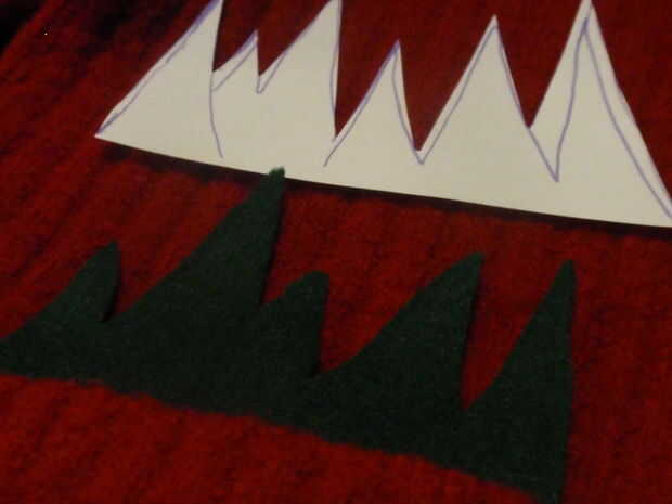 Repetí el paso de los árboles. Los bastones de caramelo eran un poco difíciles, puesto que no creo comprar fieltro rojo. Dibujó un bastón de caramelo en mi papel y córtelo hacia fuera, luego cortar el fieltro como un bastón de caramelo entero, blanco. Luego, corté las líneas diagonales, que me dio pequeños rombos. Entonces, usé cada otros rombos, dividir en dos grupos y mantener el orden. Había reorganizado en dos bastones de caramelo y me había pegado, dejando espacio entre las rayas.