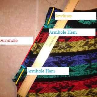 5. doble 1/4-1/2 pulgada alrededor de la abertura que ahora es el agujero del brazo. PIN. Coser con puntada de zig zag. Ver pic3. Cada referencia se coordina con la línea de color.