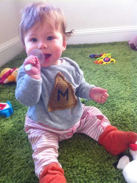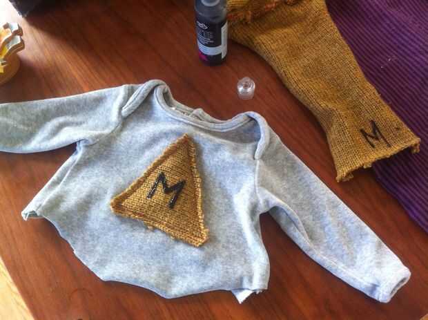 Esta gran técnica trabajada cuando encontré un mono de terciopelo gris luz fría en una tienda de segunda mano para mi niña que tenía un molesto derecho de bordado "baby boy" en el centro y que ella pasó a ser demasiado alto para usar. Por lo tanto, la corte la parte inferior de la mitad del mono y la convirtió en un suéter (que encaje la parte trasera). Para ocultar el bordado "baby boy", que cortar otra bufanda punto viejo, esta vez en forma de un triángulo y había cosido en la parte superior el suéter. Usé un poco de pintura puffy para añadir su inicial al suéter ya que tipo de como la forma de la letra "M" y el contraste que forma con el triángulo.