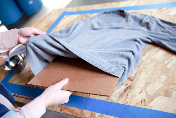 Insertar una pieza plana de plástico duro o cartón en su suéter para evitar Inkodye de la sangría a través a la parte trasera de su camisa.