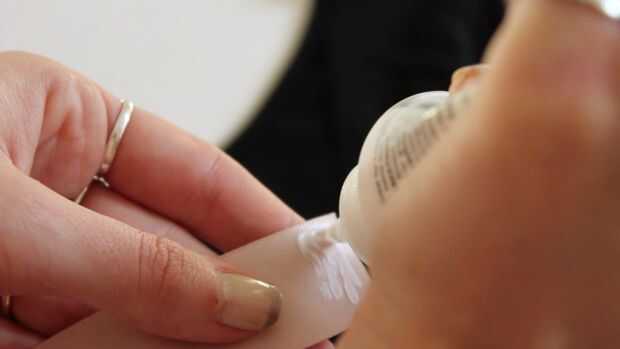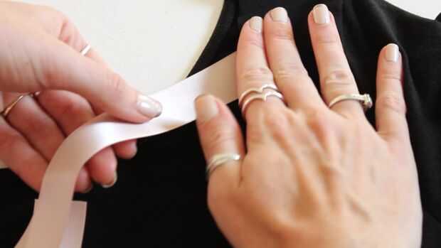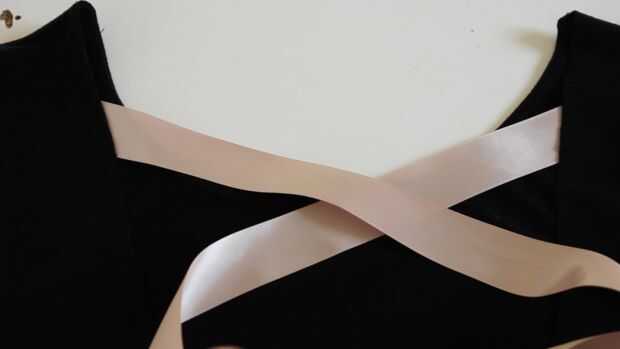 Poner pegamento para tela en un extremo y pegamento a la parte superior dentro de su escote abierto detrás.