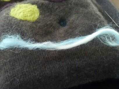 lo cool de lana es que cuando usted la pone aunque el secador fieltros lo que puede cortar el suéter sin terminar los bordes.    Decidí aprovechar este suéter de fieltro y bufanda infinity con capucha y polainas con este suéter.  Tuve la suerte de qu