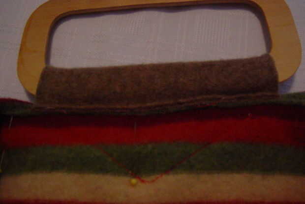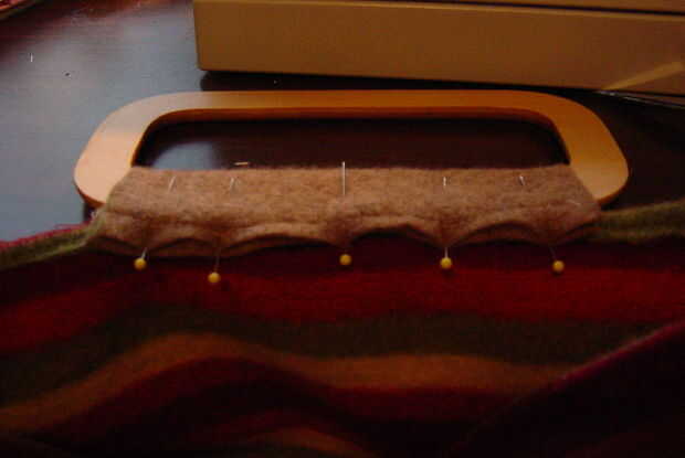Determiné la mitad de la bolsa y la manija, luego colocar el accesorio de la manija, y había fijado en lugar. Luego cosí la pieza en su lugar asegurándose de retirar los alfileres antes de coser sobre ellos (nunca una buena idea pegar un pin puede romper la aguja). Una vez que estaba contento con la colocación, la repetí en el otro lado. Había cortado a la tela sobrante de ambos lados.