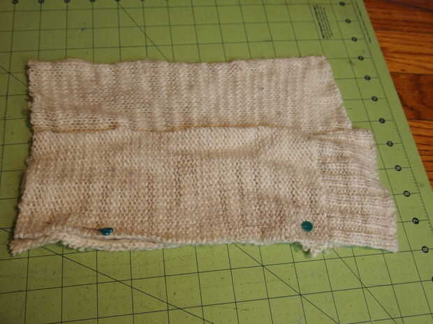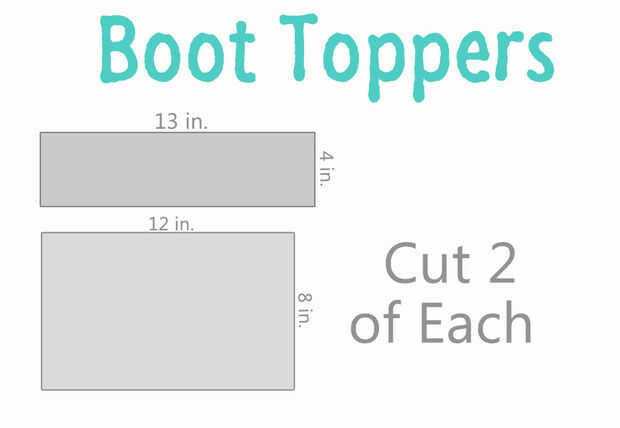 Ahora para toppers arranque! En este paso usted tendrá que cortar cuatro piezas totales - dos para cada pierna. Puede ver la imagen para más detalles. En general, utilice el mismo método del paso anterior para determinar su medida correcta. Estos toppers de arranque golpeó mi pierna en la parte media de la pantorrilla - y mi medida real alrededor de esa parte de mi pierna es de 11 pulgadas (así que he añadido una pulgada de margen). Si quieres hacerlos más como calentadores de la pierna que circulan por sus botas, entonces necesitará hacer más amplio alrededor para acomodar para la parte inferior de la misma. Mi suéter era demasiado pequeño, por lo que son primeros de la bota, pata no regular que circulan por las botas.
