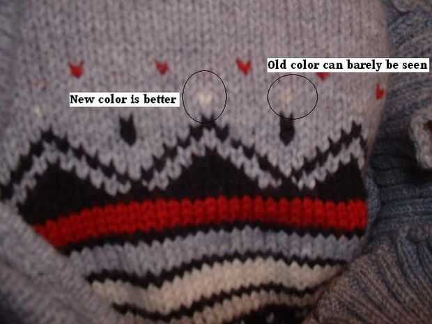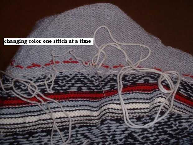 Cuando yo estaba tejiendo en los extremos, decidí que no me gustaba una de las filas de trabajo de color en el suéter de mi sobrino. Cambié por sacar una puntada a la vez y usó el método de punto duplicado para sustituirla por el bronceado ligero. Mientras que todavía luz contra el gris, me gusta el nuevo color mucho mejor.