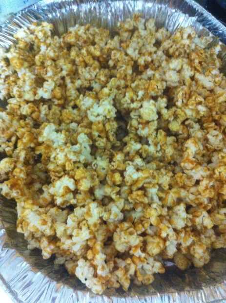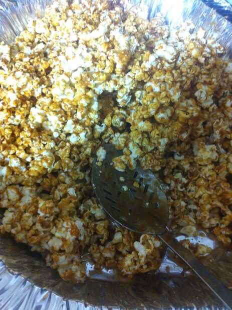Verter la mezcla fundida sobre las palomitas de maíz hecho estallar y revuelva para cubrir todas las palomitas de maíz.