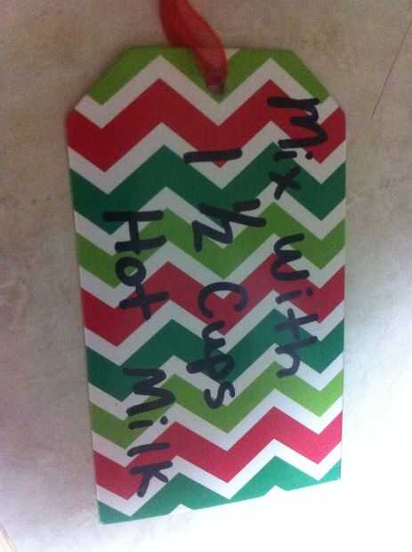 No te olvides de agregar instrucciones para ellos para su chocolate caliente. Me gusta agregar mina a 1 1/2 tazas de leche caliente. Escribí mis instrucciones en la parte posterior de la etiqueta de regalo. A continuación puedes decorar el exterior de sus adornos a su gusto y estilo.
