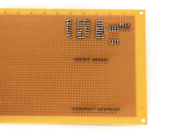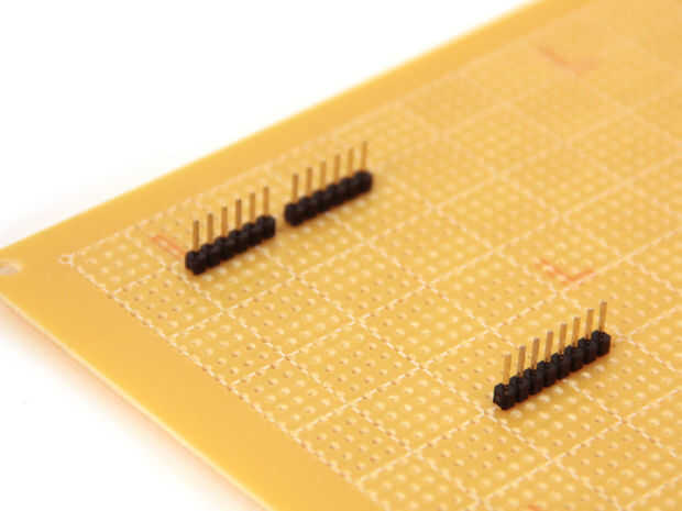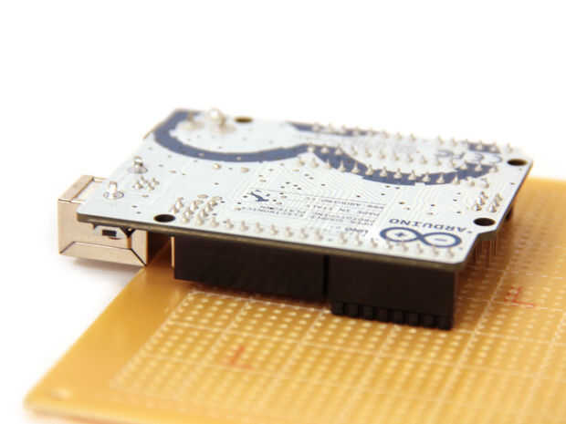 Cabecera pins para el perfboard que puede ajustar un Arduino Uno encajan en lo de la soldadura. Tenga cuidado con el espaciado de pines impares entre digitales pines 7 y 8, he diseñado este proyecto para que conecta al pin 8-13 no es necesario, es mejor omitir pernos encabezado para Arduino pins 0-13 para que las cosas encajen juntos más fácil (véase la nota de la imagen).