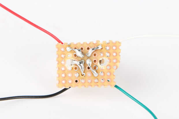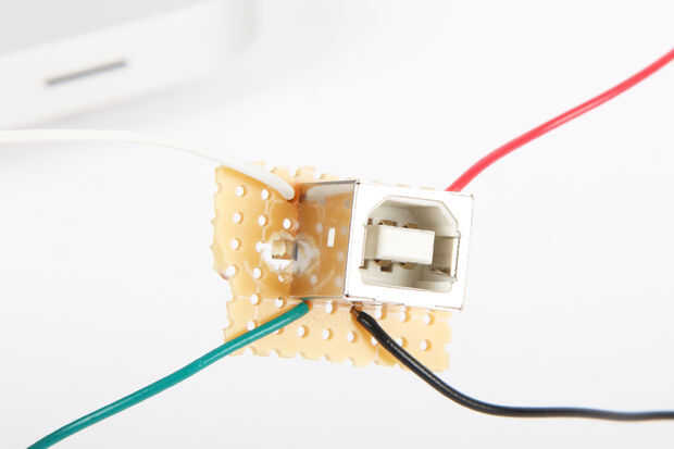 Como se puede ver en higos 9 y 10, usé un juntado las piezas de perf Junta para hacer las conexiones a la toma USB. En el otro lado del MIDI para tarjeta USB, realizar las siguientes conexiones en el Ardunio: