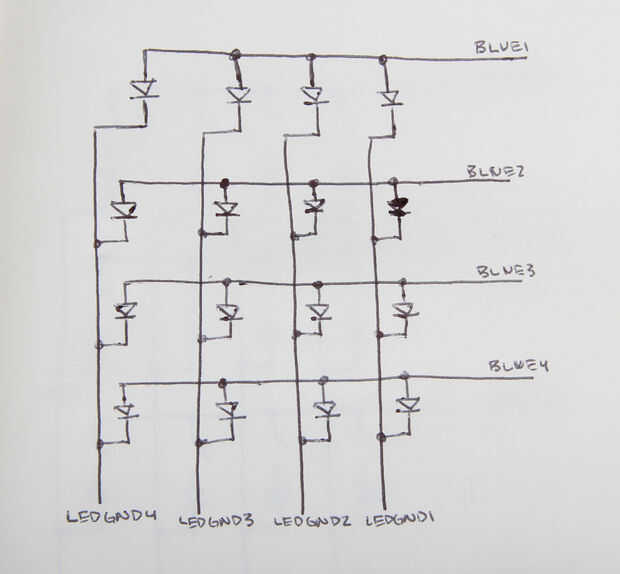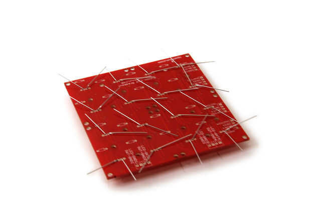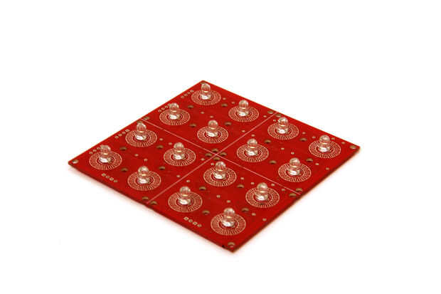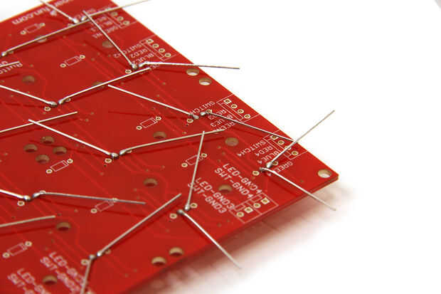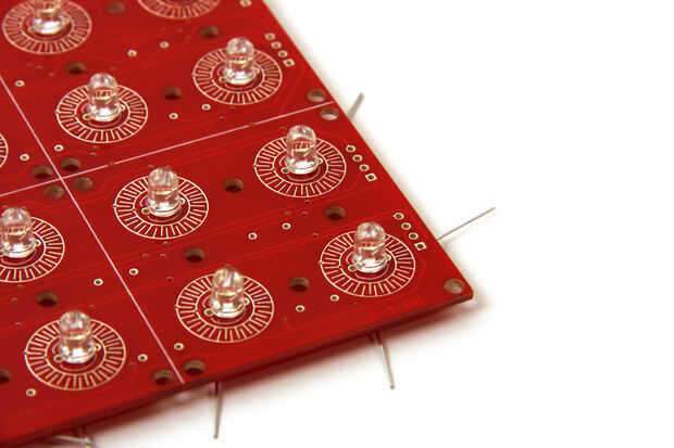 Enrosque los cables de 16 LEDs (5mm o 3mm está muy bien, utilicé 5mm) a través de orificios de LED en el PCB de Sparkfun. Estas placas son compatibles con 4 plomo RGB LED, así que hay cuatro agujeros disponibles en cada cojín del botón. Puede utilizar los dos orificios para el solo color LED (ver figura 3). Asegúrese de que el lado plano del LED (cátodo) se alinea con la parte plana de la marca en el PCB.