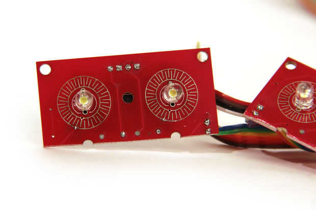 En la otra mitad del PCB, use un cable puente para conectar las tomas de "rojas" y "azules" de uno de los LEDs juntos (ver Fig. 7). Esto conectará el ánodo de tus LEDs blancos al cable de cinta.
