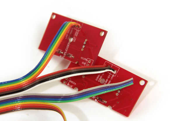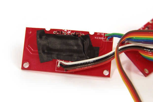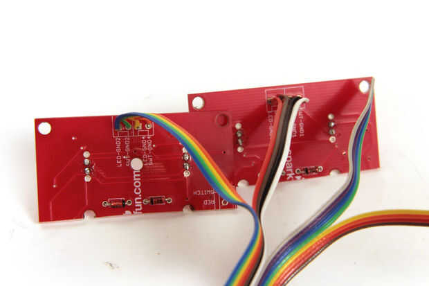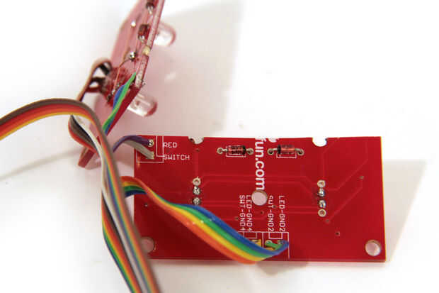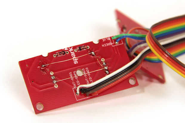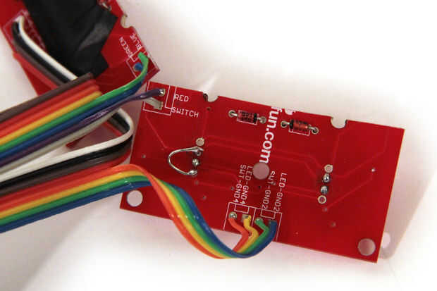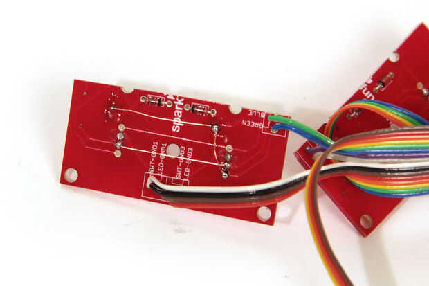 Cortar un trozo de cable de cinta y soldadura 8 varillas en los agujeros de sparkfun PCB etiquetados "interruptor gnd" y "led gnd". Soldadura de cuatro cables más a los orificios etiquetados "switch" y "azul". Ver las imágenes para obtener más información.