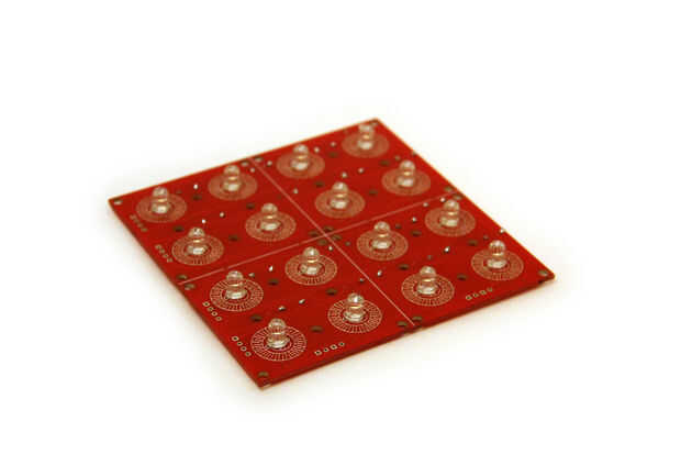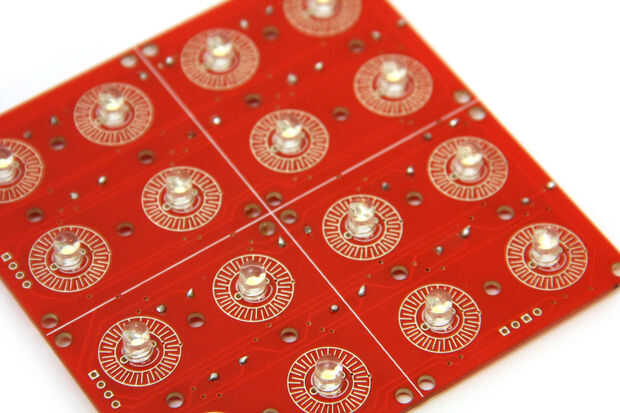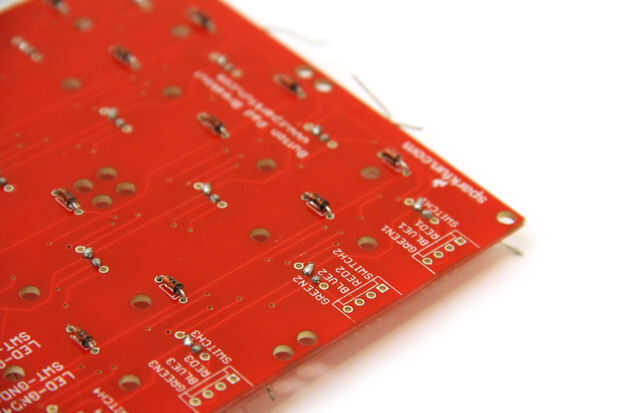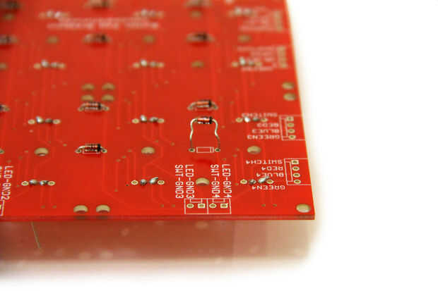 Soldadura de 16 diodos para PCB de Sparkfun. Asegúrese de alinear negro marca (cátodo) del diodo con la raya en el PCB.