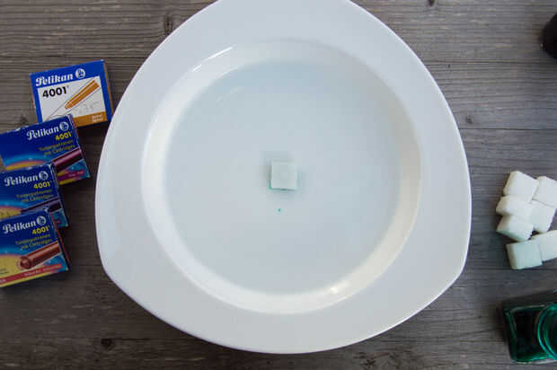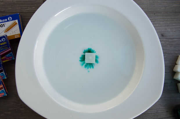Colocar los cubos de azúcar con el lado coloreado en el agua.