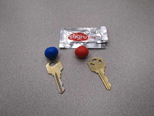 una llave de cerradura de la bici era difícil de usar, así que aplica algunos Sugru rojo en él y formado para cubrir el arco. El arco original tenía un agujero en él, para hacer posible para conectarlo a un llavero. Con un poco de retoques sensibles,