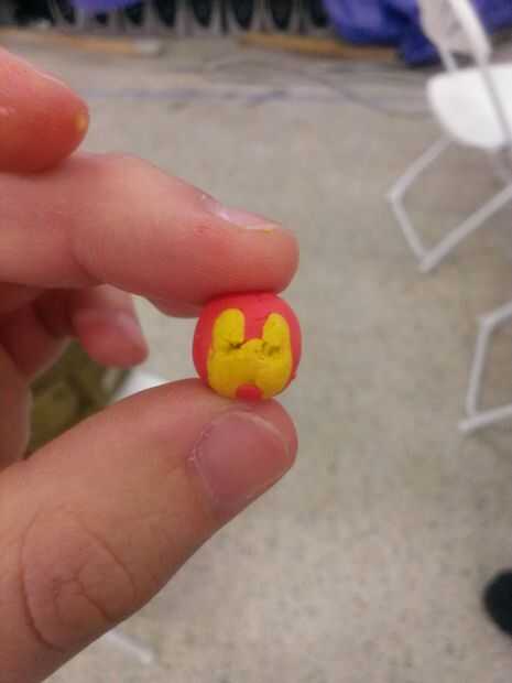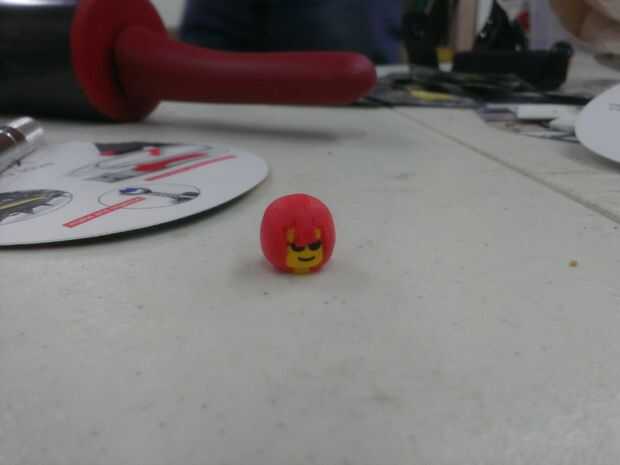 Empezar tomando una pequeña cantidad de Sugru rojo y enrollándola alrededor de la cabeza a partir de la parte posterior y superior. Parar cuando esté apenas tímido de cara de la minifigura como en la primera imagen. Si utilizas varios equipos, asegúrese de mezclar las costuras frotando suavemente el dedo hacia adelante y hacia atrás a través de la costura.