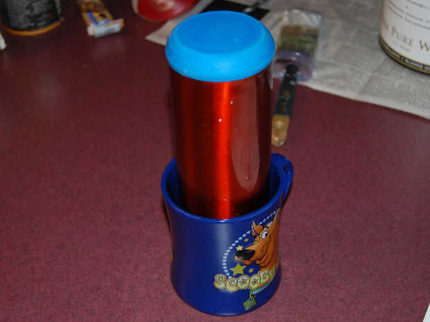El Sugru ahora necesario para curar al menos 24 horas. Por el espesor de la capa inferior (aproximadamente 3/16" en altura de nuevo) lo dejamos curar durante unas 36 horas. Tenga en cuenta la taza de Scooby Doo handy dandy usada para sostener la botella en posición vertical.