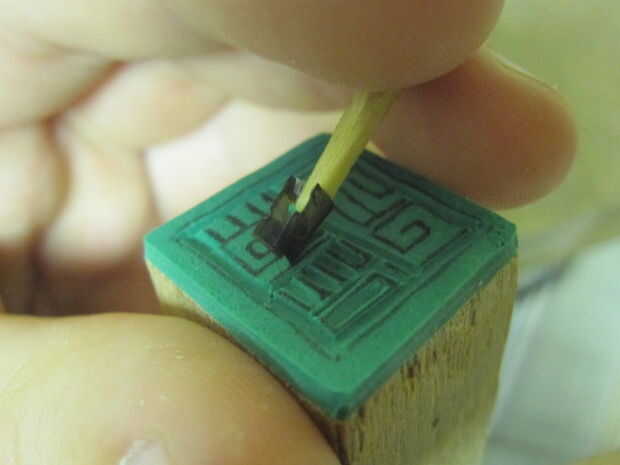 Dibujar el diseño sobre el Sugru, recuerda que se invierte cuando acabar con ella. Después de eso, utilice un cortador de impresión de bloque de linóleo para crear su diseño.