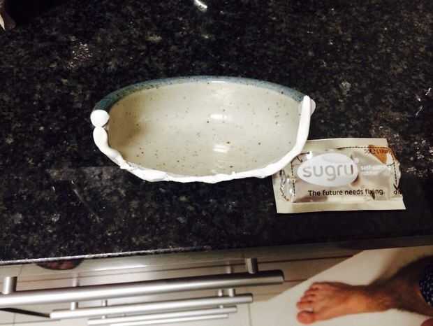 El tazón de fuente era algo fino, así que rodé una tira de Sugru, aproximadamente 4mm de diámetro y 12cm de longitud. Entonces tomé una mitad del tazón de fuente y, siguiendo la forma de la superficie rota, pegada la Sugru sobre la faz de la superficie rota.
