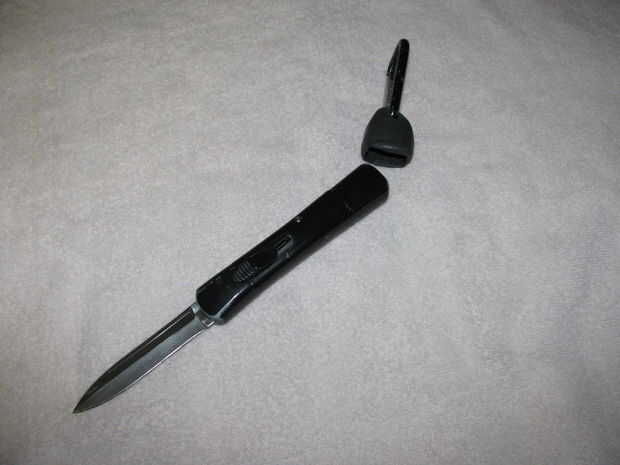un arte cuchillo o caja cortador pequeño para ir en un llavero que utiliza hojas de afeitar de doble filo estándar.No confieso una idea original pero algo I remmber mi abuelo tener. Su estaba hecho de hoja de cobre amarillo que he usado aluminio resc