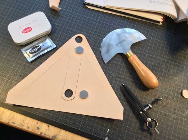 Dos piezas que emparejan de cuero fueron cortadas y agujeros fueron cortados en un lado de la piel para permitir que los imanes se siente en la piel se pegan.