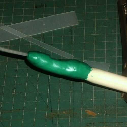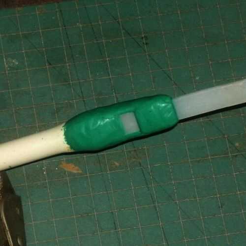 Si no puede encontrar este material, probablemente puede utilizar algo más de sobre espesor de tarjeta de crédito y que sea antiadherente por primera vez cubriéndolo con algún detergente de lavar los platos y dejarlo secar. El detergente es el mismo agente desmoldante que utilizado en la fabricación de Sugru deslizante clavija para el pito dentro de una sección de la tubería. Más en eso más adelante.