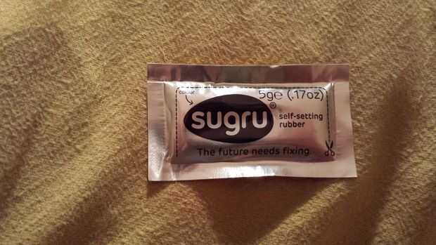 Sugru es un caucho de la uno mismo-ajuste para fijar, modificar y mejorar cosas.  Se moldea como plastilina, adhiere a casi cualquier cosa y se convierte en un caucho de silicón flexible, fuerte durante la noche.  Viene en varios colores y es ideal p