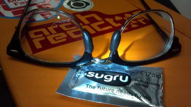 Asistí a mi local Hackerspace, Reactor de arco, en St. Louis, Missouri, esta noche y los miembros estaban trabajando con Sugru (uno mismo-ajuste de goma). Varios minutos después de que entré en la puerta, se rompió la pieza de la punta de mis gafas.