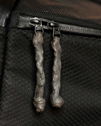 Para los dos bastante grandes (casi 4 pulgadas de largo cada una) azul tirones de la cremallera he utilizado unos 8 gramos de Sugru, o de dos sobres.  Los negros fueron un poco más pequeños, una bolsita era suficiente para ambos.