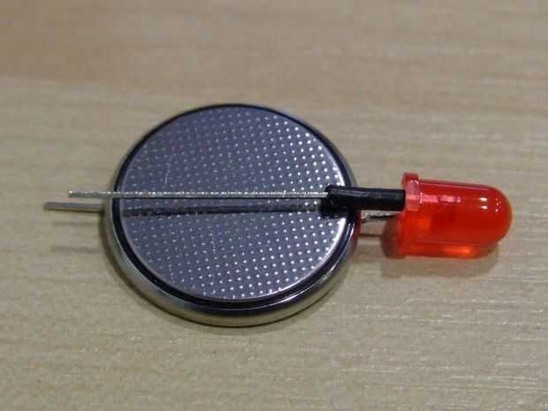 Encontrar algún alambre de chatarra y tira un trozo de su aislamiento, aprox. 0,5 cm. Deslice la pieza de aislamiento sobre la pierna más corta del LED. Esta es la pata negativa. Ahora deslice la batería entre las patas del LED para que el lado dimbled se enfrenta a la pierna con la pieza de aislamiento. El lado positivo de la batería enfrenta a la pierna más larga del LED. El pequeño pedazo de aislamiento es el truco que mantiene el LED apagado. Tiene la pata negativa sólo lo suficientemente lejos para que no haga contacto con la batería.